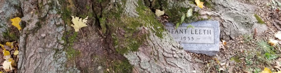 Perhaps not quite as sad, but nearly so and every bit as thought-provoking, was the burial place of “Infant Leeth” born and died in 1955. No hyphen. In all likelihood, the parents have joined their child in eternity, so we can’t ask what happened. Nor can we learn the story behind the oddity of the tree swallowing their child’s marker. Did the grieving, distraught parents plant a little sapling in memory of their little one? Or did one of the myriads of maple seeds just happen to land a couple feet from “Infant Leeth” and take root? More unsettling to consider, though, is why no one noticed the encroaching trunk as the years rolled by. When the first tentacle from the maple’s root system made its way to the stone, why didn’t some forward-looking loved one see to it that the marker was protected? Or was there no loved one to visit, to object to the trespass, to protect “Infant Leeth”? Why didn’t an observant, thoughtful, compassionate caretaker, seeing what was sure to take place in years to come, take the tree out? Does anyone remember this little one? Questions without answers. Once again, time eventually will have its way.